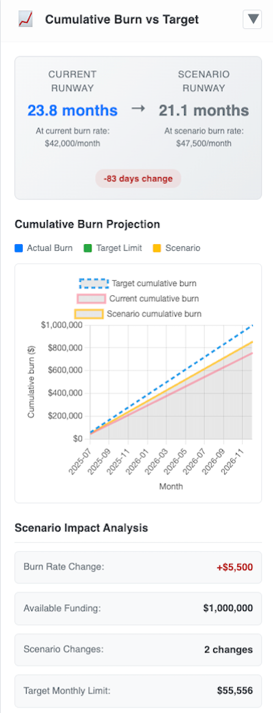 Model different hiring timelines and see how they impact your runway. Compare conservative vs aggressive growth plans.