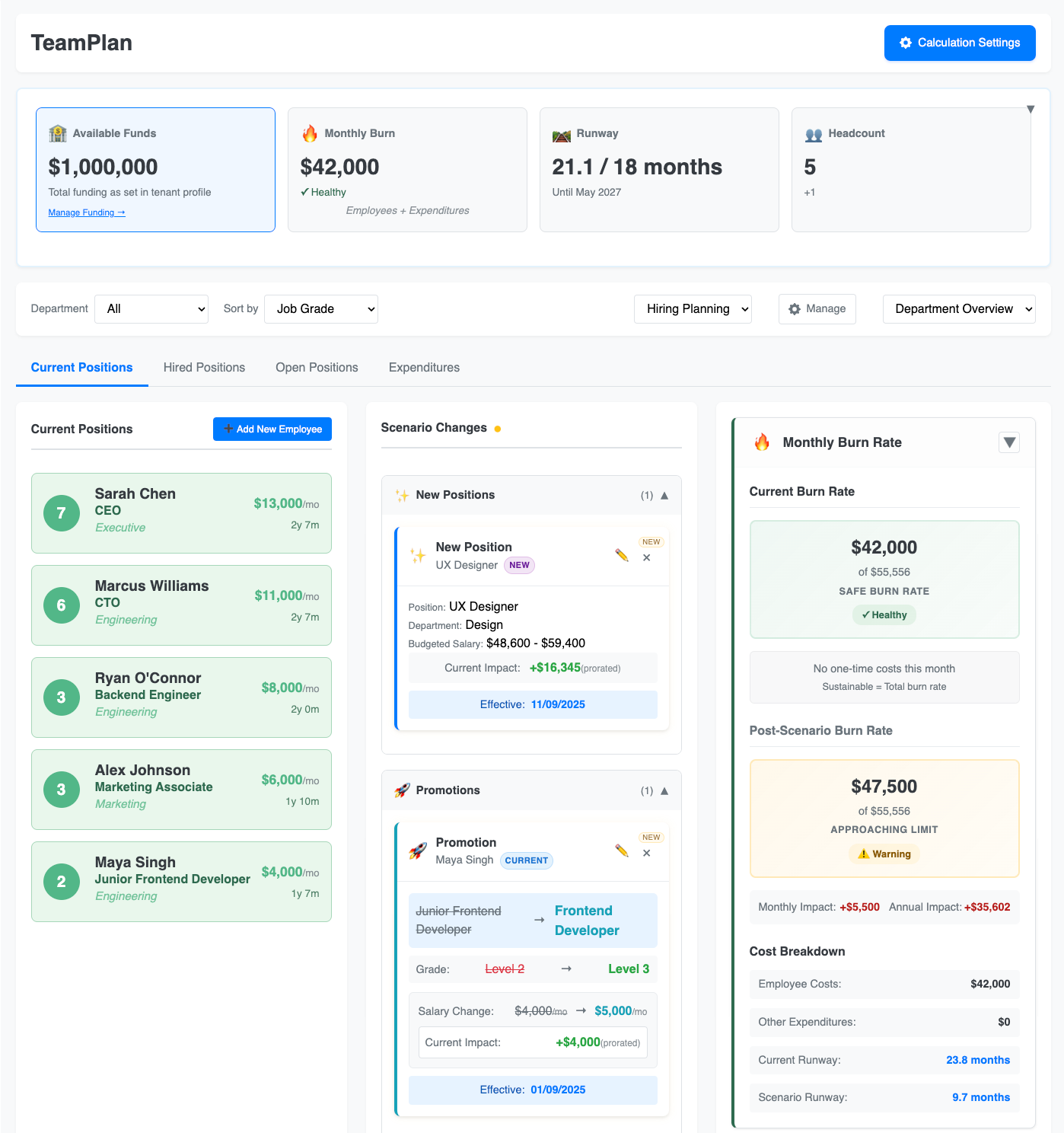 Track current employees, open roles, and hiring pipeline. See your org chart and cost structure at a glance.