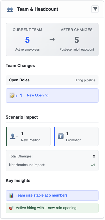 Track current employees, open roles, and hiring pipeline. See your org chart and cost structure at a glance.